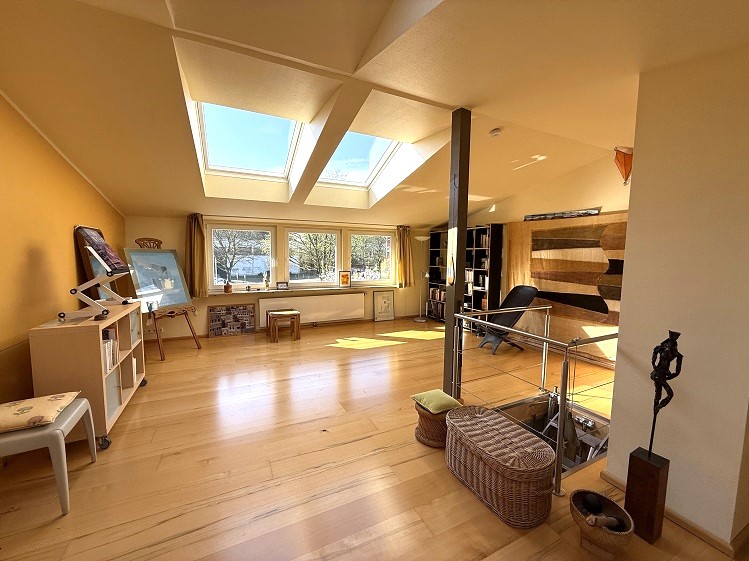 Mit rund 7 Zimmern bietet es reichlich Platz zum Wohnen, Arbeiten und für Ihre Hobbys. Insbesondere die in 2006 nachträglich aufgesetzte Gaube bietet einen wunderbaren Rückzugsort – perfekt als Büro, Atelier oder einfach nur als Ruhezone. Die eingebrachten Fenster sorgen für hervorragende Lichtverhältnisse, die diesen Raum zu einer absoluten Wohlfühloase machen, die über eine elektrisch ausfahrbare Treppe erschlossen wird.