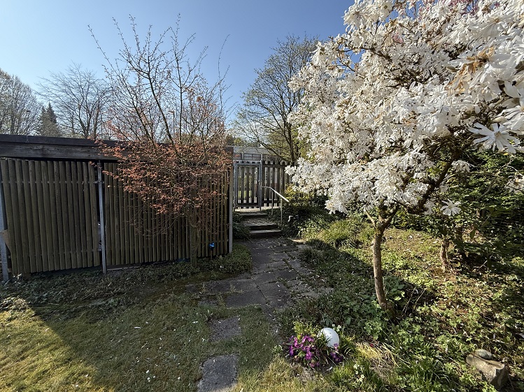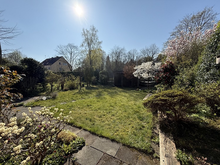 Der nach Süden ausgerichtete Garten ist der optimale Platz für Entspannung, aber auch für Freunde des Gärtnerns. Ein praktischer Schuppen bietet Raum für Gartenutensilien – ein kleines Tor die Möglichkeit, Grünschnitt zur Straße hin abzutransportieren und den Weg in und aus der Innenstadt ein gutes Stück abzukürzen.